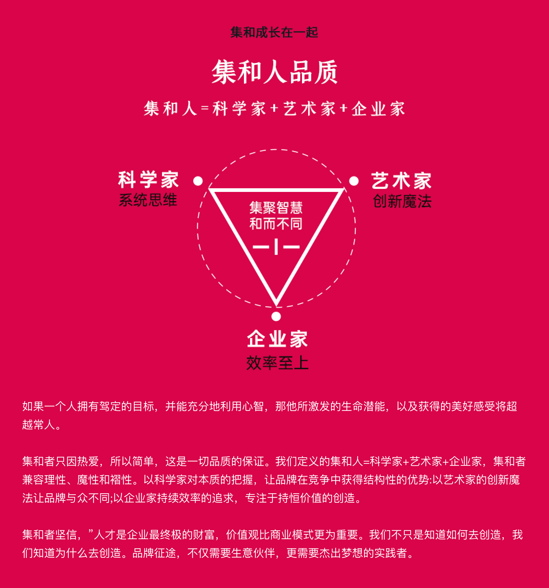 集和来自于一个意志归一的使命:让杰出梦想成为品牌。如同宇宙来自一个奇点,万物一系,在归一意志的召唤下,集和组织有了目标,有了恒定的方向。每个独特的个体各归其位,发挥着各自的天赋优势。
